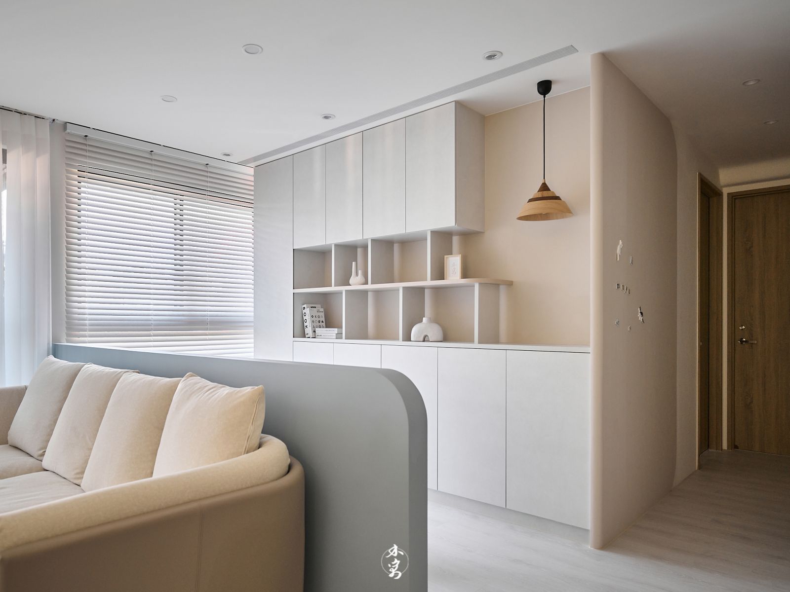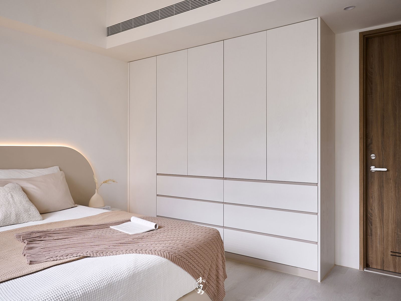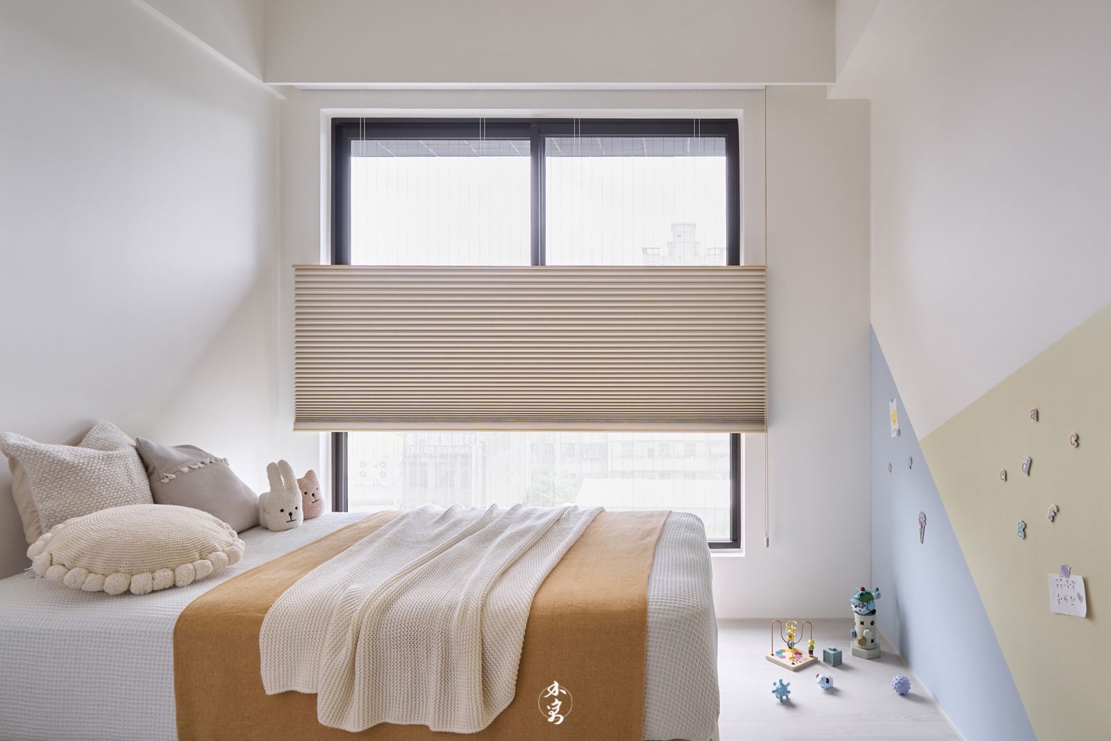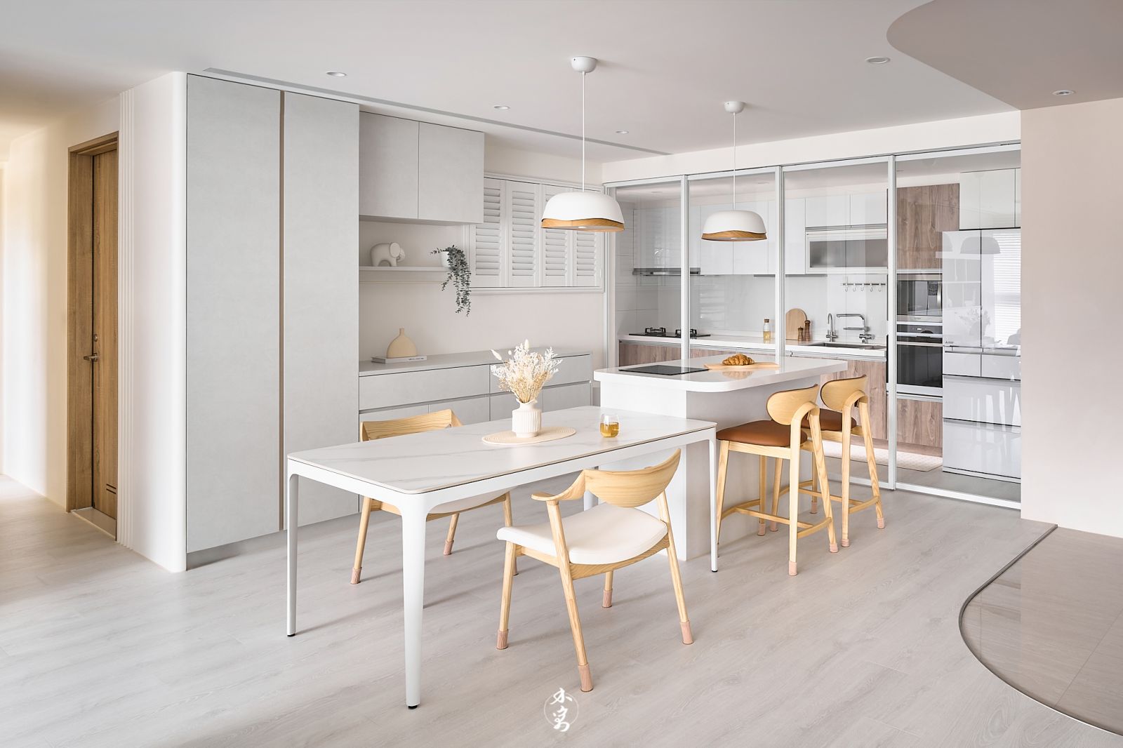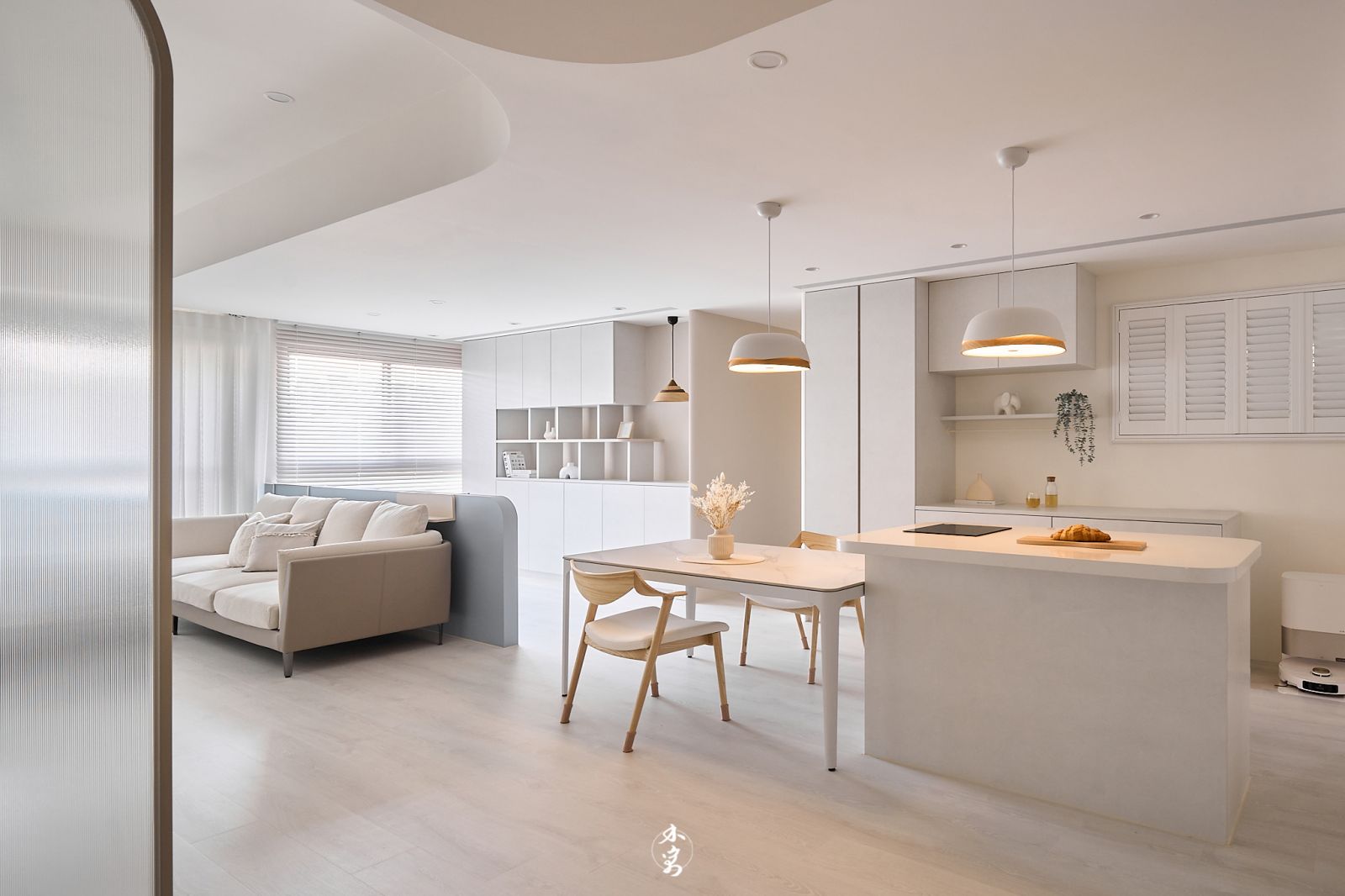 The kitchen is enclosed by elegant glass sliding doors, allowing for easy supervision of children while letting sunlight in to maintain brightness. At the same time, it effectively keeps cooking odors contained. A multifunctional island doubles as an appliance cabinet and a space for casual dining, enhancing both functionality and social interaction. Along the corridor, walls finished in a soft buttercup hue are coated with magnetic blackboard paint, transforming them into an ever-evolving canvas for creativity—where daily inspirations and fleeting ideas take shape. This thoughtful playfulness extends into the children’s bedroom, where a vibrant accent wall introduces a joyful energy while maintaining the home's cohesive aesthetic. The master bedroom adopts a minimalist yet intimate approach, its curved headboard subtly echoing the gentle lines and tones of the entrance, reinforcing the seamless language of the design.