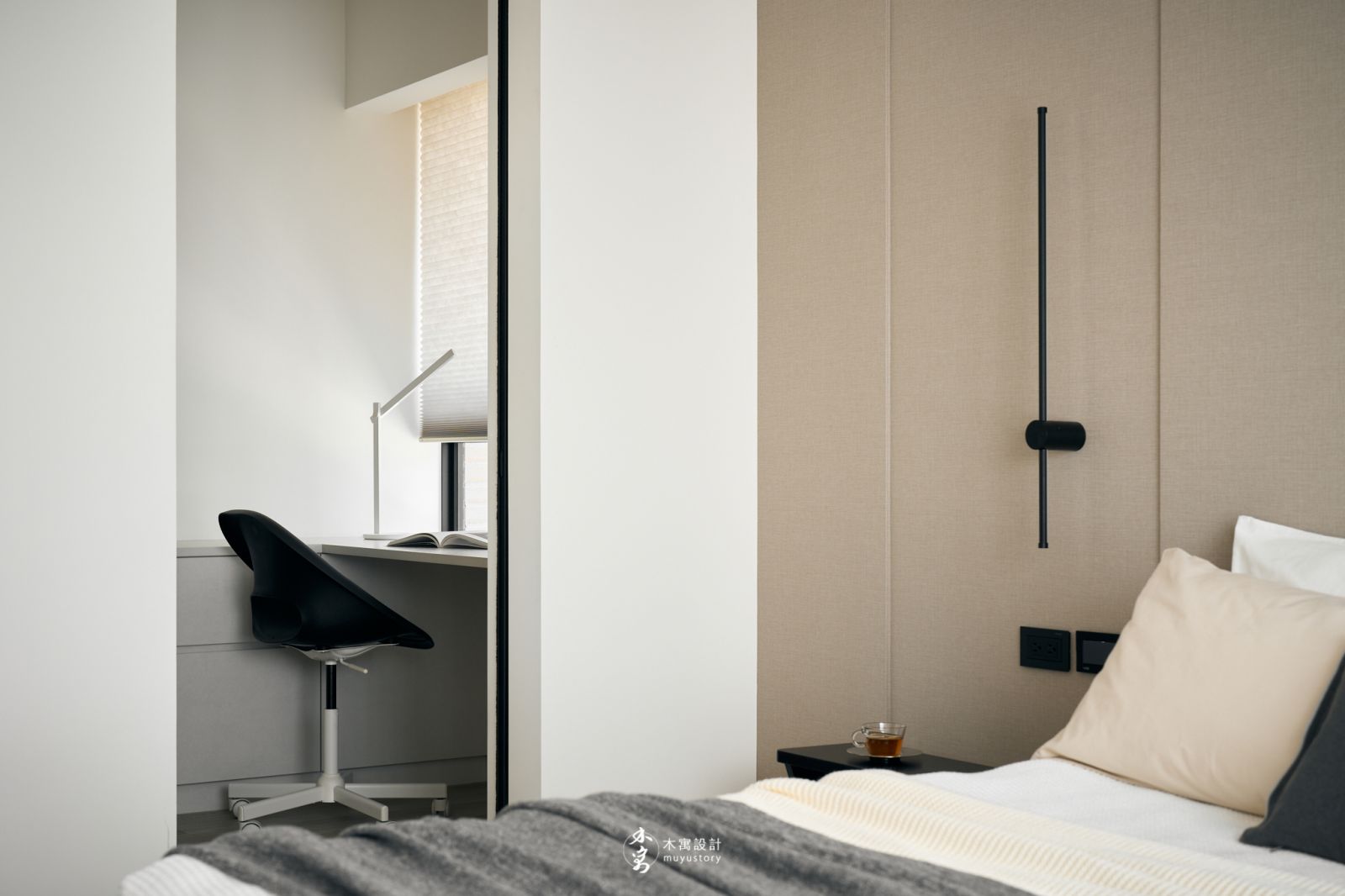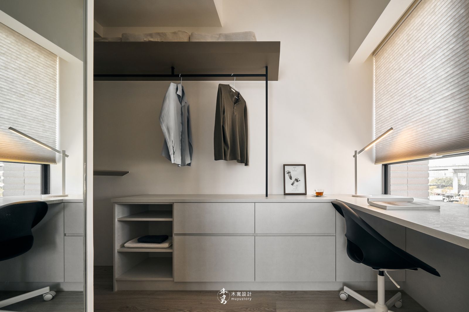 In the master bedroom, soft lighting and woven-textured wallpaper a warm, serene retreat. The open-format walk-in wardrobe is organized according to the homeowners' daily habits, promoting ease and order. Facing the window, a versatile work desk doubles as a vanity area, providing a functional space not only for evening tasks or light remote work but also for self-care routines, accommodating modern lifestyles with both flexibility and comfort.