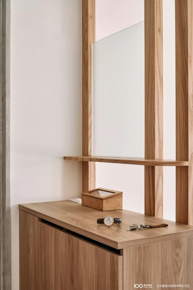以格柵+半玻璃的方式做出了屏風,下方則是櫃子,這樣的屏風不僅不會讓人覺得太壓迫,而且也不會擋到採光,導致整個玄關看起來很陰暗狹窄。