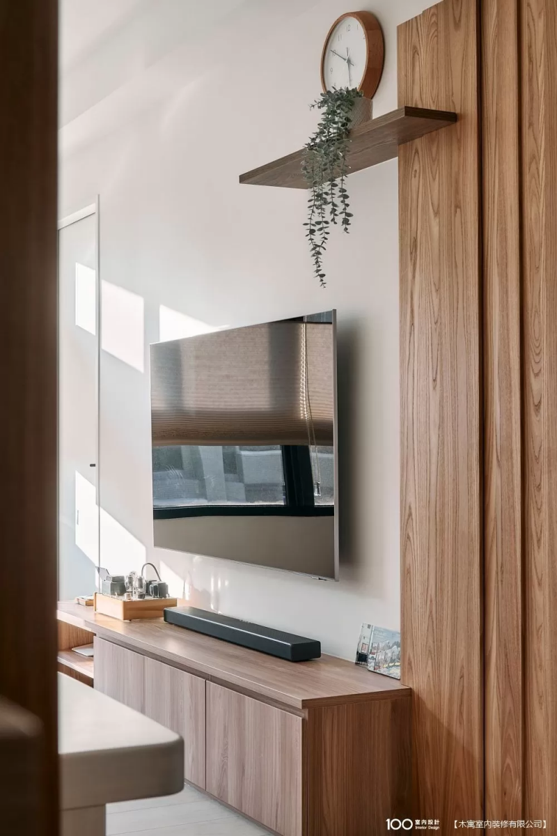 因為房間門位置的關係,導致電視牆原本看起來還蠻窄的,不過設計師索性規劃了木頭色的隱藏門,然後有再加寬一些,讓門和裝飾性的木作融合,另一個房門則是和電視牆一樣的白色系,這樣望過去真的有種電視牆很寬闊的感覺耶!