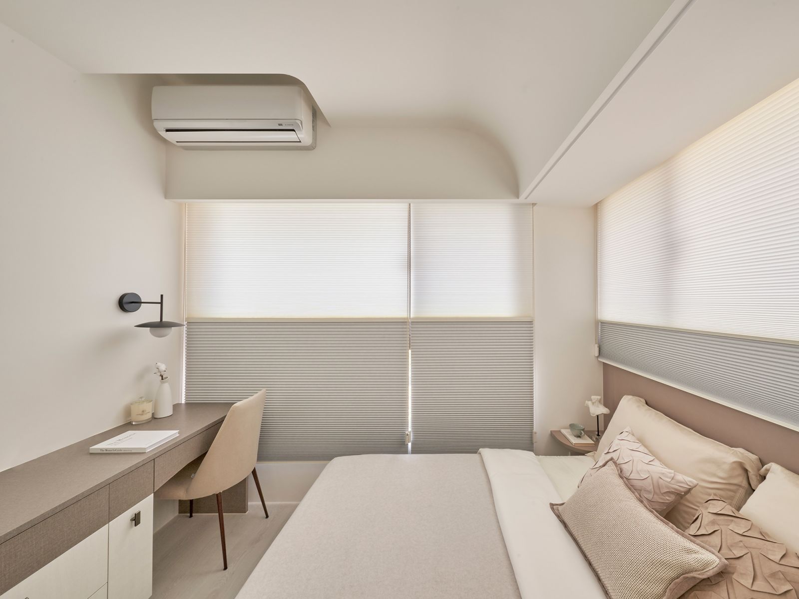 The private area continues to be simple in nature, and the ceiling is curved to eliminate the pressure of large beams, while the end of the room is decorated with linear lighting to a soft sleeping atmosphere, creating a soothing home scenery like a spring breeze and a gentle reflection of the room.