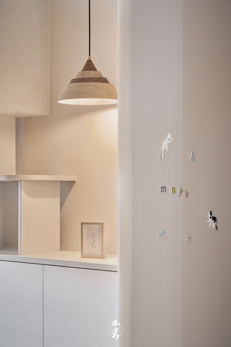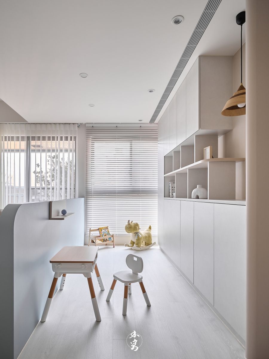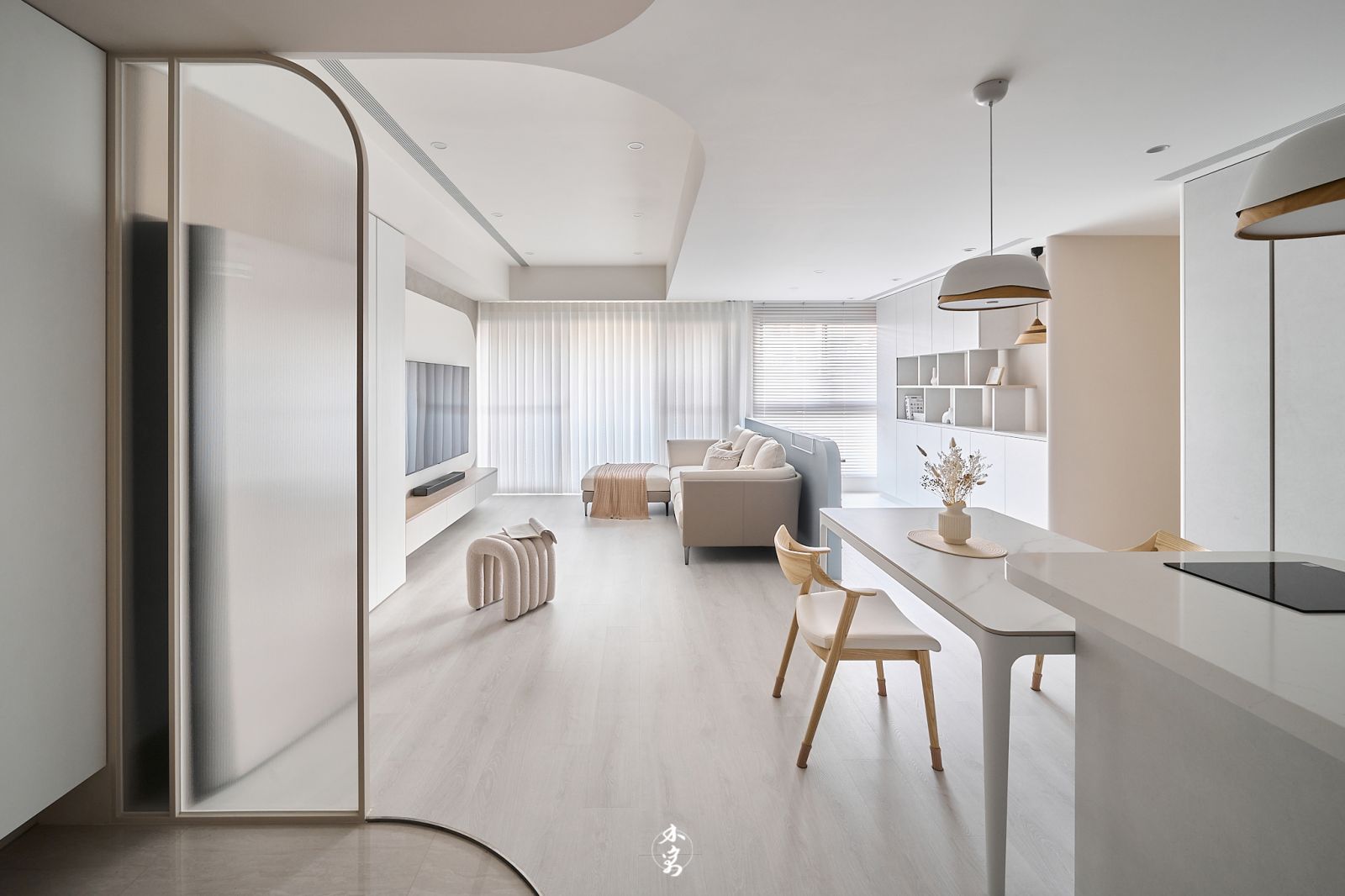 The kitchen is enclosed by elegant glass sliding doors, allowing for easy supervision of children while letting sunlight in to maintain brightness. At the same time, it effectively keeps cooking odors contained. A multifunctional island doubles as an appliance cabinet and a space for casual dining, enhancing both functionality and social interaction. Along the corridor, walls finished in a soft buttercup hue are coated with magnetic blackboard paint, transforming them into an ever-evolving canvas for creativity—where daily inspirations and fleeting ideas take shape. This thoughtful playfulness extends into the children’s bedroom, where a vibrant accent wall introduces a joyful energy while maintaining the home's cohesive aesthetic. The master bedroom adopts a minimalist yet intimate approach, its curved headboard subtly echoing the gentle lines and tones of the entrance, reinforcing the seamless language of the design.