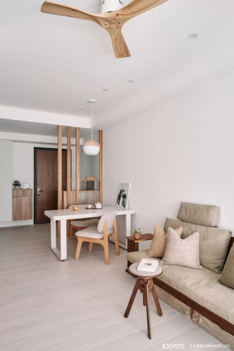 由於坪數不大,設計師把客廳的天花板盡量挑高,看起來會比較開闊些,另外也建議裝個吊扇,說這樣蠻符合我們家風格,而且也不用另外買電扇(占空間又不好看),後來我們在GOODFAN挑到了一眼就超喜歡的吊扇,裝上了以後效果真的很不錯,天花板不會看起來空空的。順帶一提,一開始失心瘋先買的沙發是QUATTIS十刻的~很喜歡他們家具家飾的風格,還有整個木製做工的細緻度都很棒。