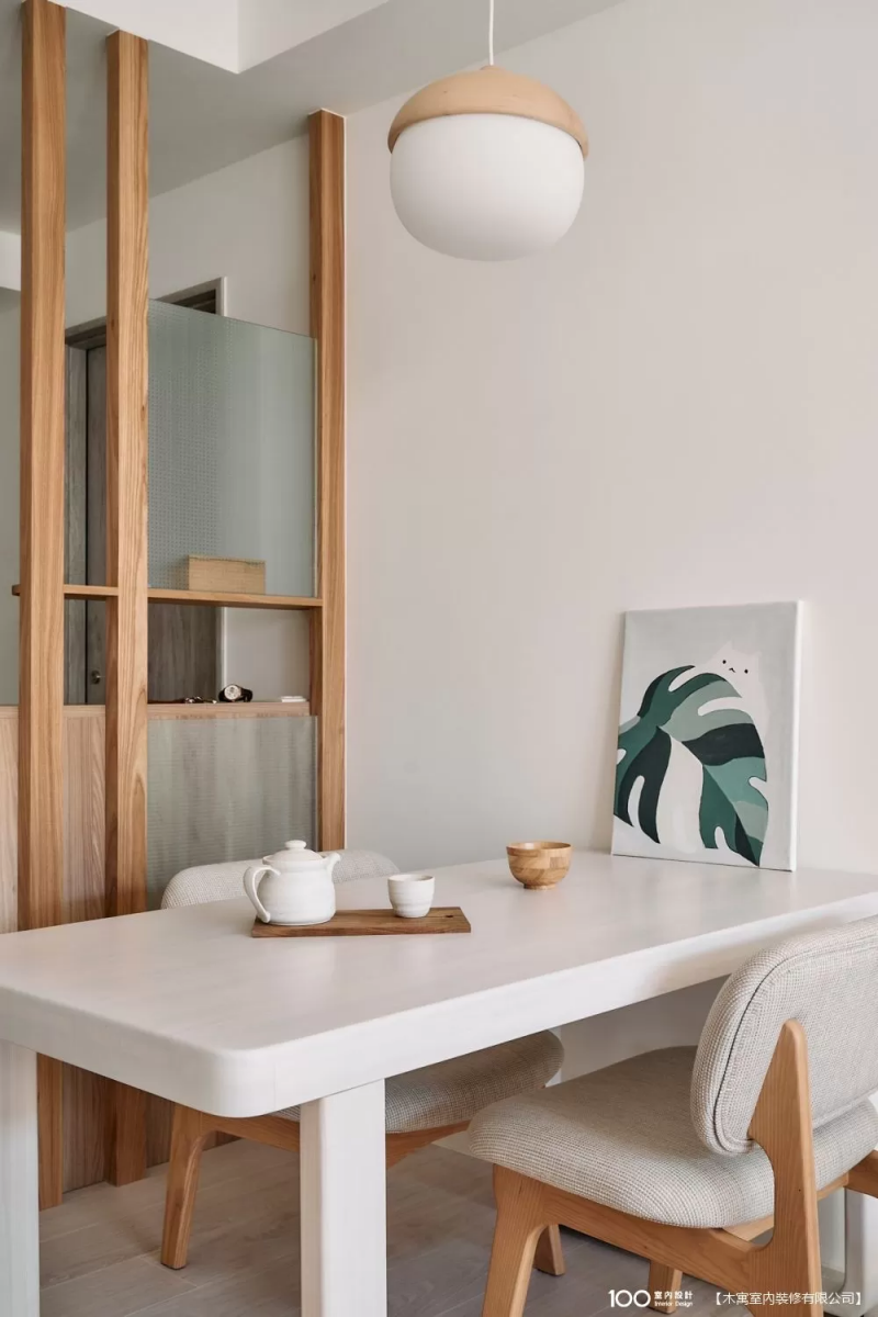 公領域是比較長形的,客廳旁邊剛好有位置放餐桌椅~這邊我們選了喜歡的餐桌和餐椅,再請設計師提供選色建議,那因為桌子有導圓角,餐椅也是選擇比較柔和的款式,再搭上一盞圓圓的栗子吊燈,整個非常可愛又溫馨~超喜歡!