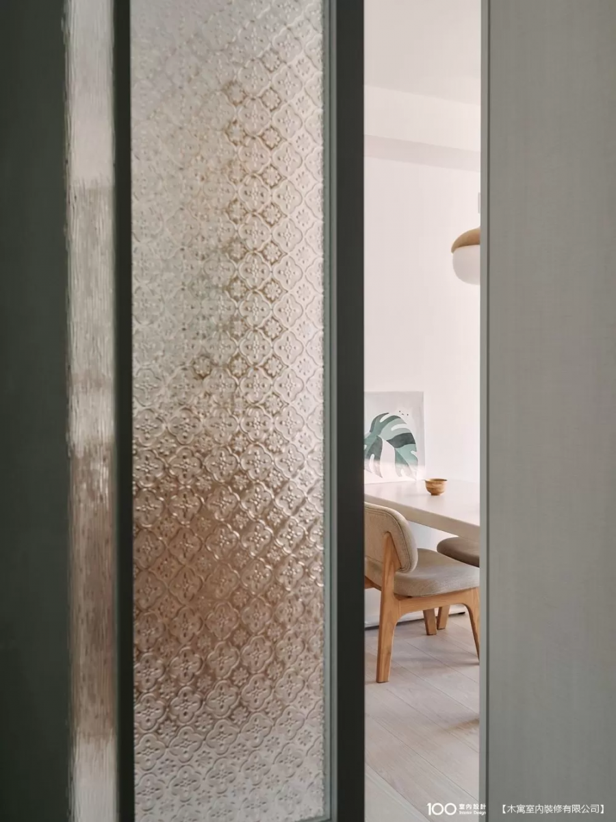 最後廚房選了玻璃拉門,那時有跟設計師提到喜歡復古風的玻璃,希望整面都用海棠花玻璃,但設計師說做整面容易看起來俗氣,於是就混搭了波紋玻璃,有種復古與現代融合、迸出新滋味的感覺XD