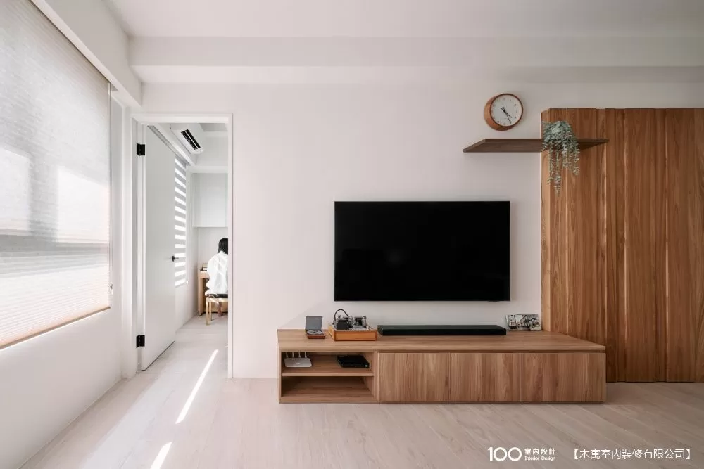 因為房間門位置的關係,導致電視牆原本看起來還蠻窄的,不過設計師索性規劃了木頭色的隱藏門,然後有再加寬一些,讓門和裝飾性的木作融合,另一個房門則是和電視牆一樣的白色系,這樣望過去真的有種電視牆很寬闊的感覺耶!