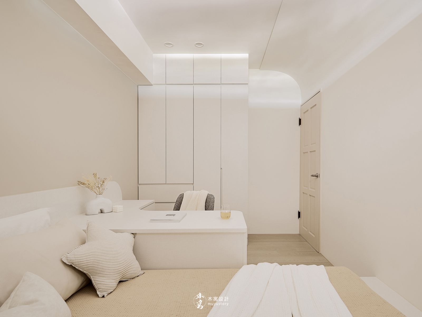 先生:簡潔、簡約 ! 常常斷捨離所以不需要太多的收納,喜歡自然光,希望視覺是寬敞、明亮的,關於這部分書房有因此往後挪動,也喜歡樑圓弧、圓滾滾的設計。